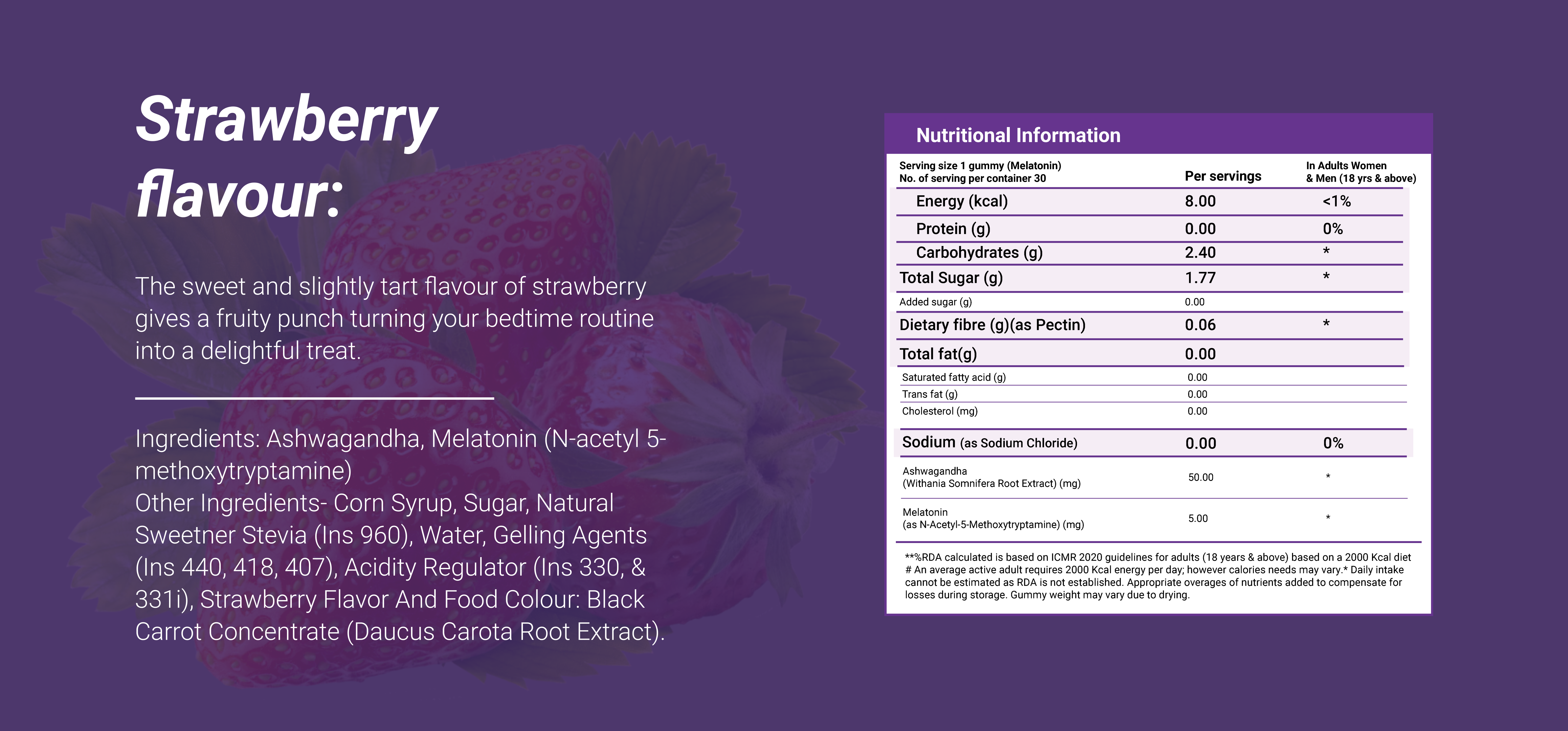 The perfect sleep solution has arrived now! Filled with the richness of Melatonin and Ashwagandha, the gummies can help you fall asleep in just 30 minutes. Be it jet lag, stress, occasional sleeplessness, or other sleep issue, these gummies can help you with all. No more depending upon those habit-forming pills and tablets, switch to our non-habit-forming gummies to make your night's sleep peaceful and stress free.